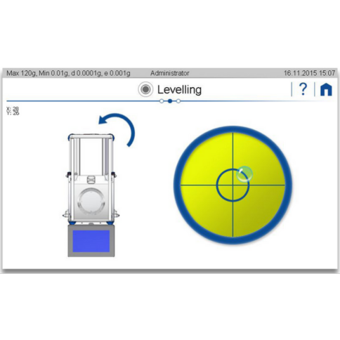 The intelligent electronic levelling system alerts the user when the balance needs levelling. To reset the position of the balance correctly, a levelling guide is displayed on the screen. Using arrows the balance shows which direction the feet need to be moved to level the balance.