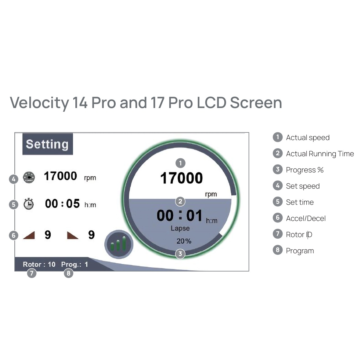 The Velocity 17 Pro is the excel version of the 14 Pro which protects your sample by refrigeration with higher speed spin. It inherits all the features of Velocity 14R Pro but with higher speed and RCF up to a maximum speed of 17,000 RPM / 22, 294xg.